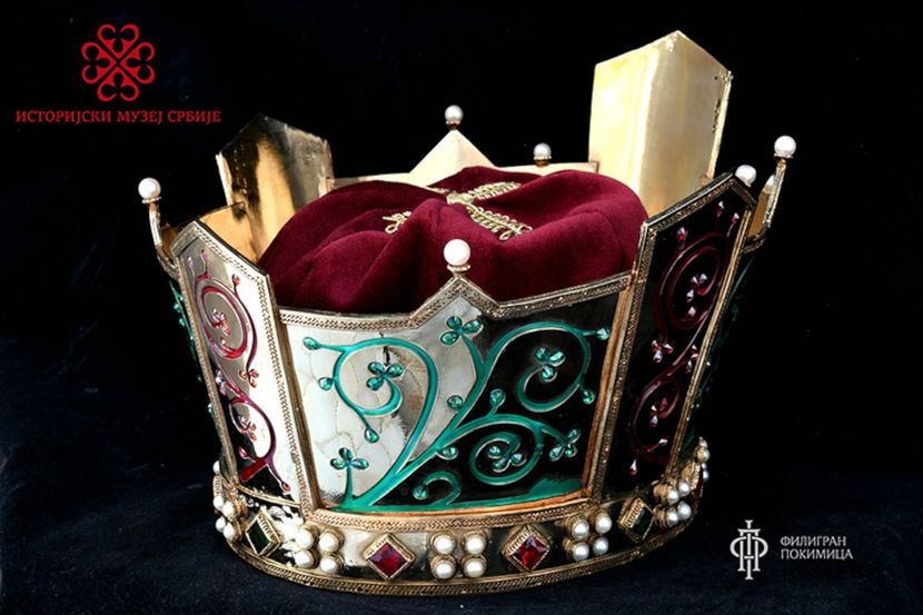 Kruna srpskog despota je ručno urađena od pozlaćenog srebra brojnim starim tehnikama i dekorisana smaragdima, granatima i slatkovodnim biserima.