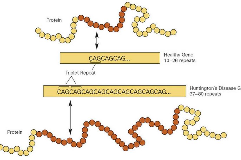 Broj CAG ponavljanja u većini neurona nije bio daleko da onoga pri rođenju, ali određeni neuroni za koje se smatra da prvi umiru tokom Hantingtonove bolesti – strijatni neuroni – akumulirali su mnogo više ponavljanja pre smrti. Do 98% je imalo 60-73 CAG-a, a nekoliko je imalo stotine.
