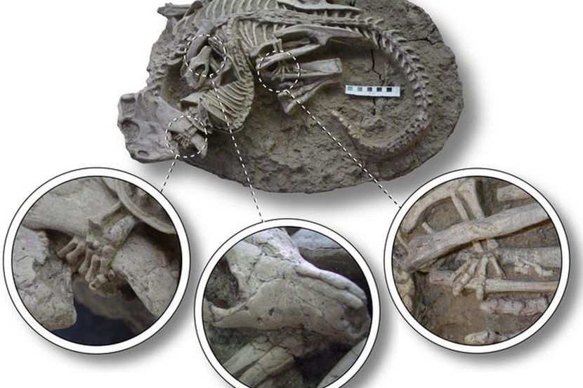 Reč je o fosilu dinosaurusa poznatog kao psitakosaurus, koji je bio velik kao veći pas. Ovi biljojedi su među najraniji dinosaurusima sa rogovima koji su živeli u Aziji u doba rane krede, pre između 125 i 105 miliona godina. Druga životinja je sisar veličine jazavca nazvan repenomamus robustus. Iako nije bio velik ako se uporedi sa dinosaurusima, u doba krede bio je jedan od najvećih sisara.